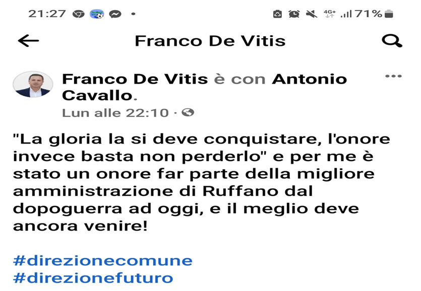 Siccome ho la sensazione che qualcuno possa essersi offeso dal mio articolo, per una lettura insufficiente e superficiale, che tra l’altro non chiama in causa né l’operato del sindaco né dell’amministrazione comunale, a scanso di equivoci confermo la mia opinione: Cavallo è il miglior sindaco che potesse avere Ruffano in questo contesto storico. Così siamo contenti tutti.