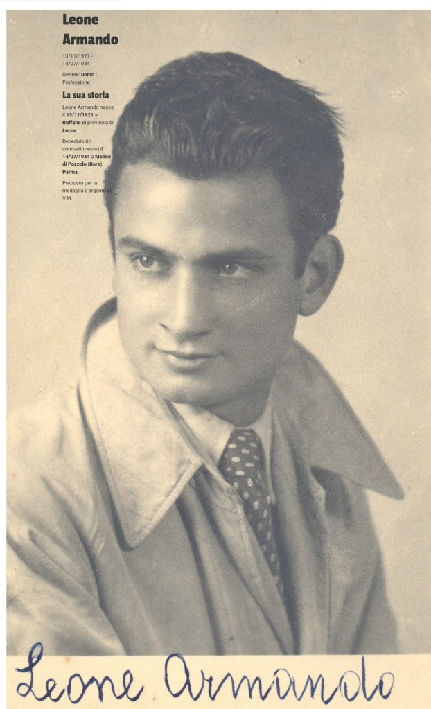 Armando Leone, un nostro compaesano, cugino di mio padre. Morto a 23 anni nel luglio del 1944 trucidato insieme ad altri quattro suoi compagni dai nazifascisti a Molino di Pozzolo in provincia di Parma. E’ stato l’unico partigiano ruffanese e uno dei pochi salentini. E’ morto per quell’ideale di libertà che non ha conosciuto così come non ha mai conosciuto sua figlia. Il suo nome di battaglia era “Carlos”.